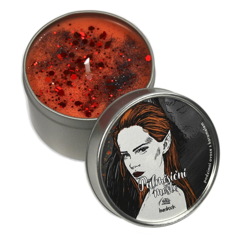 Vonná svíčka s fanartem ke knize Půlměsíční město od S. J. Maas. Oranžový vosk s červenými třpytkami a vůní podzimního ovoce s karamelem ti pomůže vytvořit si doma útulnou čtecí atmosféru! Vyrobeno v limitovaném množství ze sójového vosku, který je ekologicky šetrný, veganský a nevylučuje škodlivé látky. Svíčku dostaneš v plechovém obalu o průměru 6 cm a výšce 5 cm. Svíčku nech vždy hořet do té doby, než rozteklý vosk pokryje celý povrch.