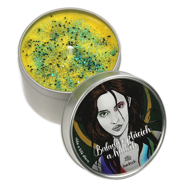 Vonná svíčka s fanartem ke knize Balada o ptácích a hadech od Suzanne Collins. Žlutý vosk se zelenými třpytkami a vůní růže a bílé dřevo ti pomůže vytvořit si doma útulnou čtecí atmosféru! Vyrobeno v limitovaném množství ze sójového vosku, který je ekologicky šetrný, veganský a nevylučuje škodlivé látky. Svíčku dostaneš v plechovém obalu o průměru 6 cm a výšce 5 cm. Svíčku nech vždy hořet do té doby, než rozteklý vosk pokryje celý povrch.