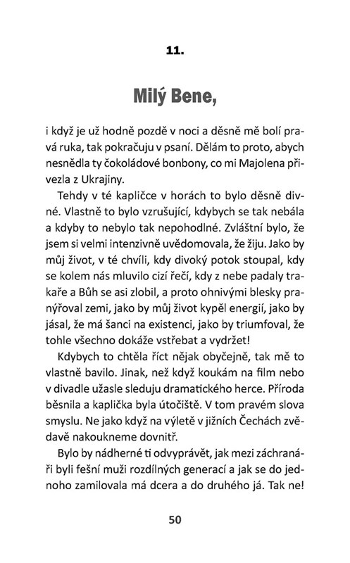 Milý Bene… tak začínají všechny příběhy, pocity a vzpomínky, které si autorka vyměňuje s bratrem své první lásky. Z očí do očí by si toho určitě tolik neřekli, ale dopisy unesou intimní tajemství, trapasy, kritiku a také v nich lze vyjádřit touhy a naděje, že i když člověk stárne, nic se neděje! Existuje totiž i láska na tisící pohled, protože láska se nedá omezovat ničím. Rozhodně ne kontinenty, vlastními i cizími dětmi, a už vůbec ne věkem!