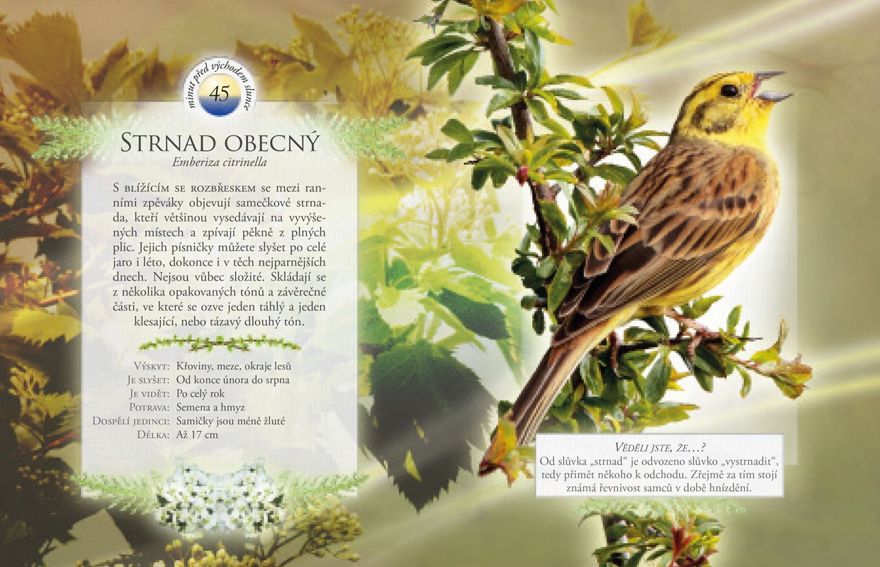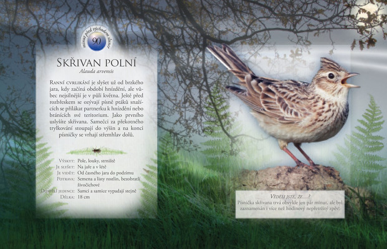 Věděli jste, že ptáci každé ráno zpívají v určitém neměnném pořadí a že koncem období hnízdění jsou slyšet většinou už jen nezadaní samečkové? S touto optimistickou knížkou se můžete probouzet za zvuků ptačího zpěvu, odpočítávat minuty do východu slunce a ještě se dozvědět, jací ptáci zrovna zpívají a co si zpěvem sdělují. Zvukové knížky z této edice jsou neotřelým oknem do živočišné říše pro malé i velké, kteří rádi pozorují přírodu a snaží se jí i naslouchat.