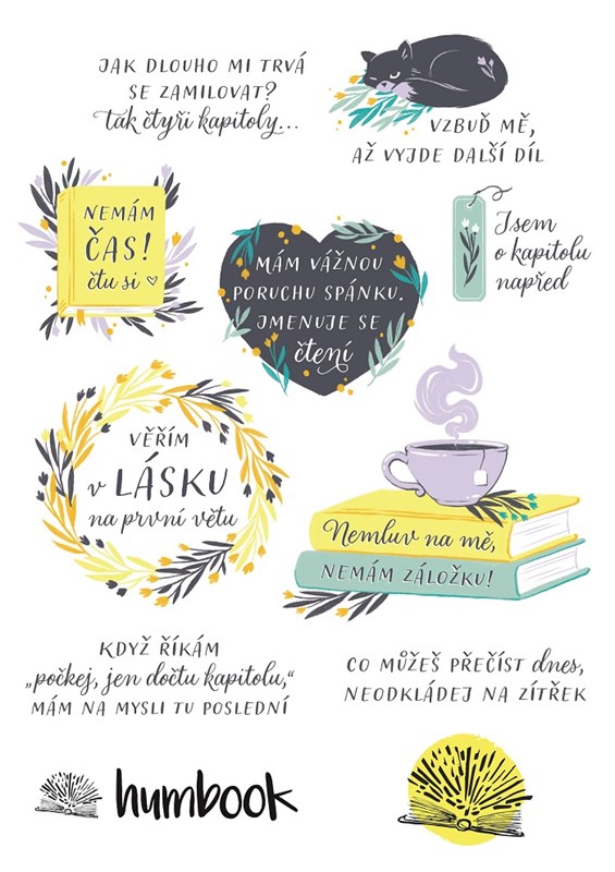 Nemluv na mě, nemám záložku! Co můžeš přečíst dnes, neodkládej na zítřek. Věřím v lásku na první větu. Tyhle samolepky s trefnými knižními hláškami v tom mají jasno a ozdobí i tvoje sešity, diáře, notebook a vůbec všechno, co tě napadne. Platí totiž jednoduchá rovnice: vylepši = vylep si! Arch o rozměru A5 obsahuje devět samolepek s knižními citáty a jednu s logem Humbooku.