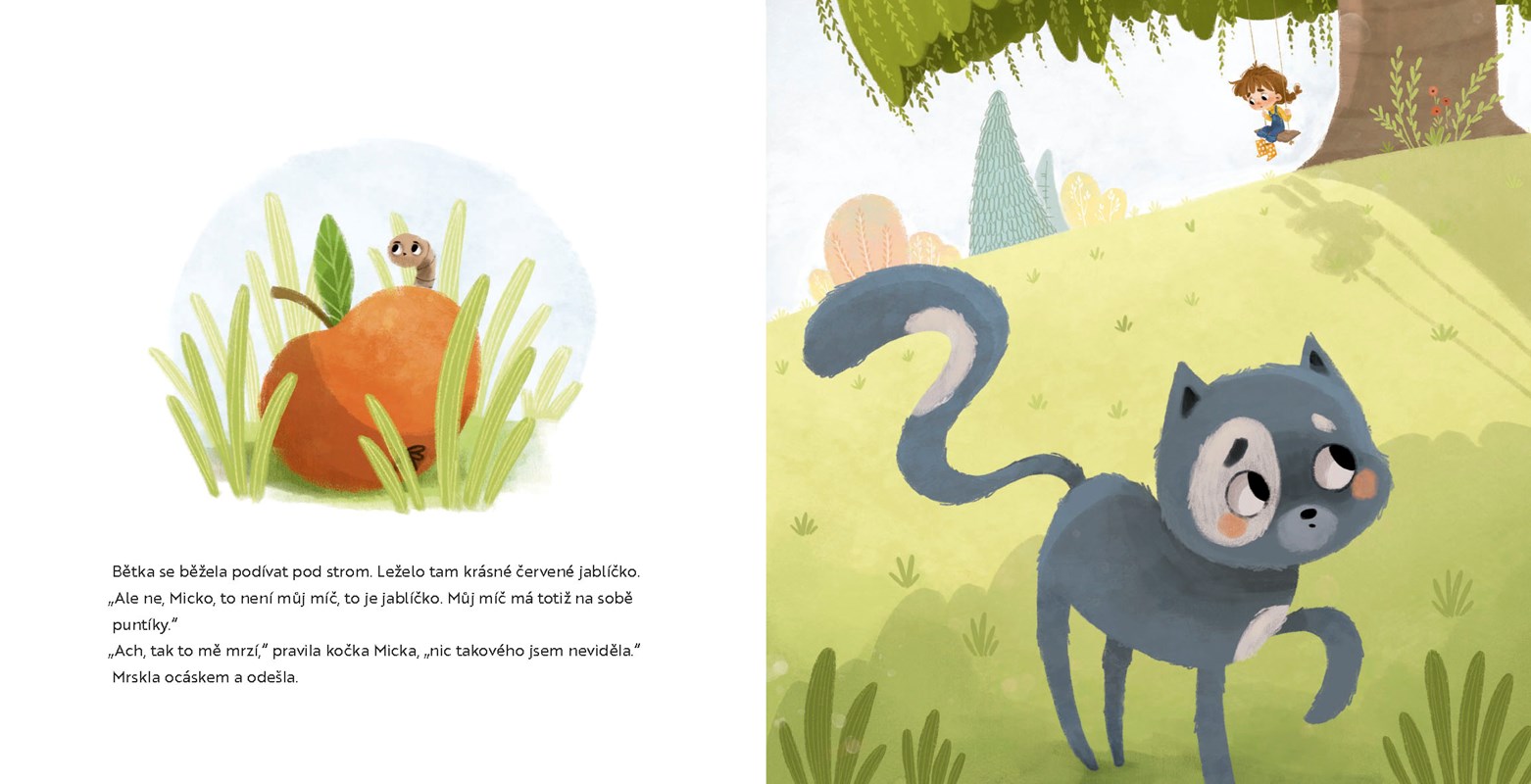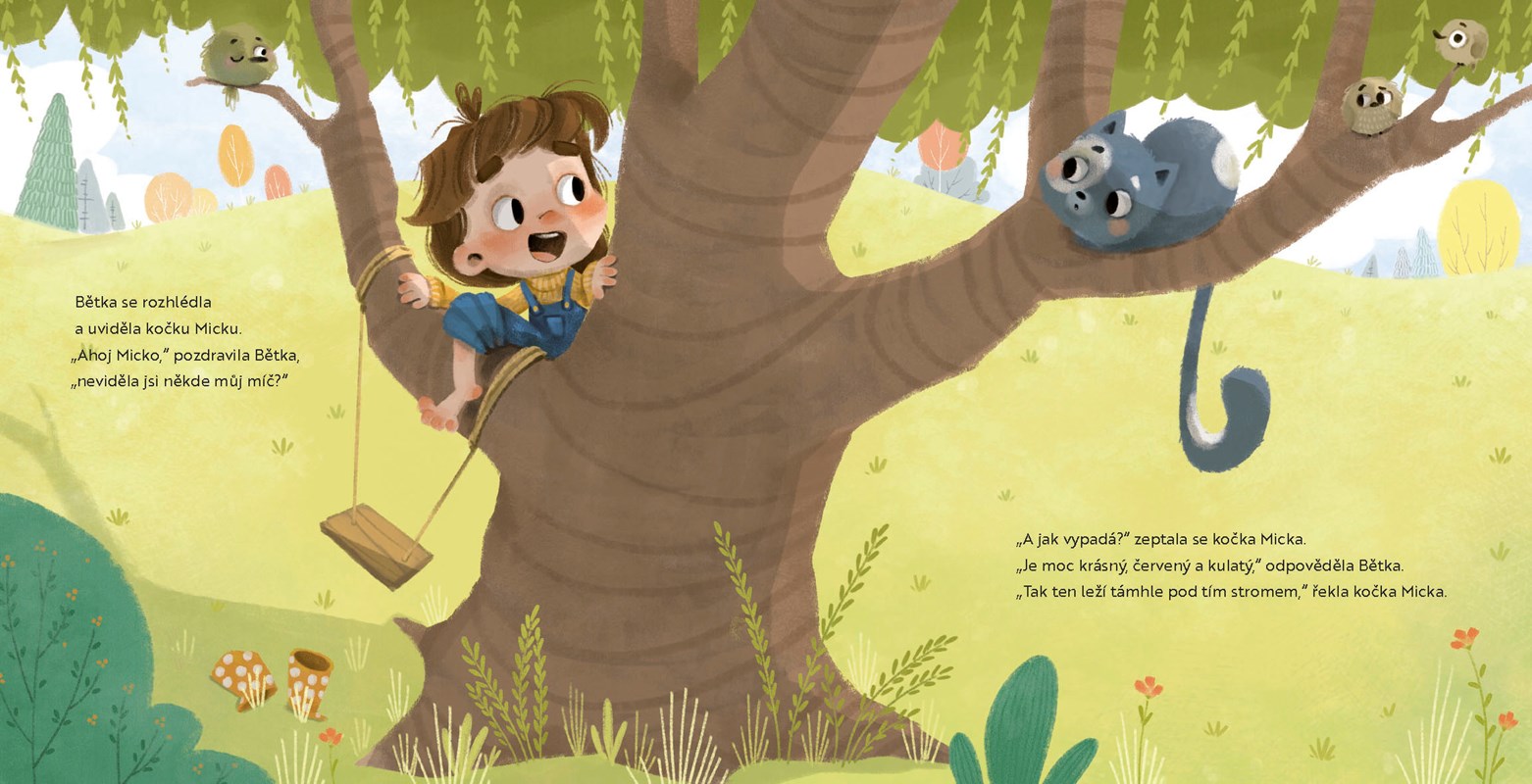 Sluníčko krásně hřeje a Bětka vyběhla ven, aby si pohrála s míčem. Kam se však zakutálel? Dokáže ho s pomocí motýlka, kočičky Micky, pejska Alíka a zvědavého zajíčka, který přihopkal na zahradu, najít?