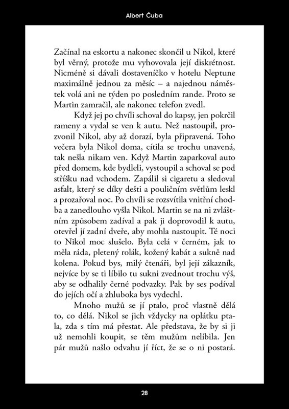 Krátká akce, která měla být dílem jediné noci, se tak trochu zvrtla. Když o tom přemýšlím, ani to nemohlo jinak dopadnout… Pasák, jeho nejlepší prostitutka, zkorumpovaný politik, rádoby investigativní novinář a kriminalista, co chce za každou cenu udělat kariéru. Tak tihle lidé se neměli nikdy potkat. Ale stalo se. Neptejte se mě, jak k tomu došlo, nechtějte vědět, co si mezi sebou povídali. Někdo přišel o život hned a někdo až později… Těžko říct, kdo na tom byl ve výsledku vlastně líp. Ve městě tam na severu, kterému se říká černé, přece chutná pomsta tak sladce! Debutový noir román ostravského herce, režiséra a performera Alberta Čuby vás překvapí vybroušeným vypravěčským stylem i neobvyklým žánrem, těšte se na skutečně fantastický čtenářský zážitek!