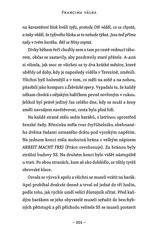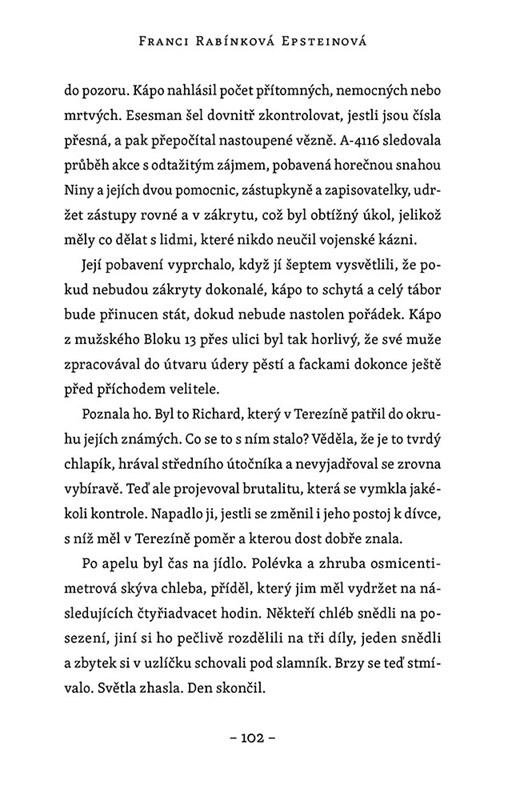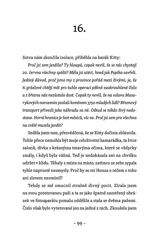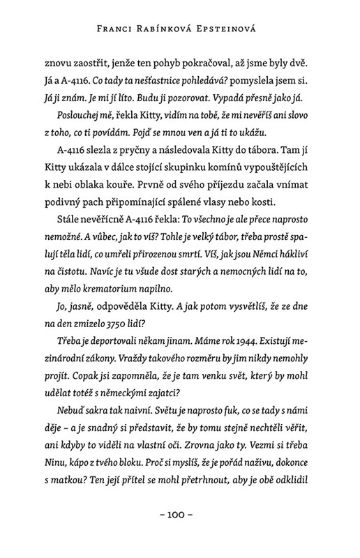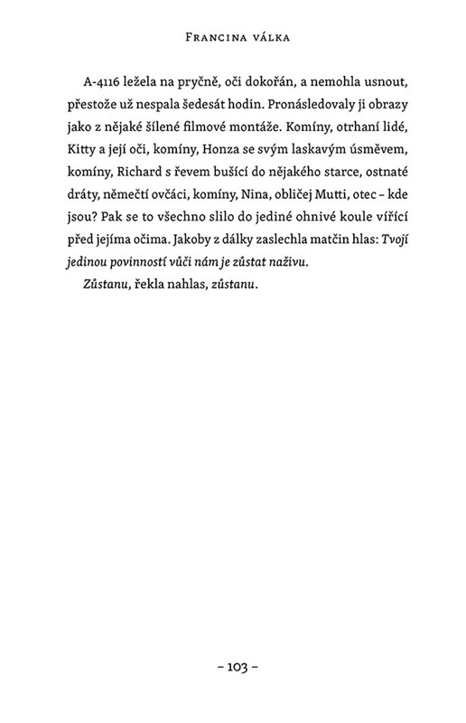 Mladá Franci Rabínková vyrostla v privilegované pražské rodině a získala skvělé vzdělání. Čekala ji budoucnost majitelky rodinného módního salonu a oddané dcery a manželky. Po přijetí nacistických protižidovských zákonů se ale vše rychle mění a v létě roku 1942 je dvaadvacetiletá Franci Rabínková i s rodiči deportována do Terezína. Zde začíná její tříleté putování přes Osvětim-Birkenau a nucené práce v Hamburku až do Bergen Belsenu. V dubnu 1945 tábor osvobozují Britové a v létě téhož roku se Franci konečně vrací do Prahy, ovšem její svět už nikdy nebude stejný jako před válkou.