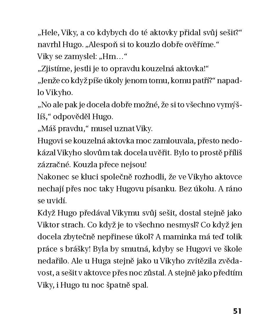Na jaře se do blízké říčky vrátili raci, a tuhle vzácnou podívanou si druháci Viktor a Hugo nemohli dát ujít. U vody však zvědavý Viky na mokrém svahu uklouzne – dokonale se zmaže a školní aktovku promění v potrhanou kouli. Když se kamarádi sklesle loudají přes park domů, na lavičce sedí dva pánové, kteří vypadají jako ze starého filmu. A jeden z nich Vikymu nabídne novou brašnu. Viky si ji rád vezme, ale pak nestačí kulit oči, co aktovka všechno dovede!