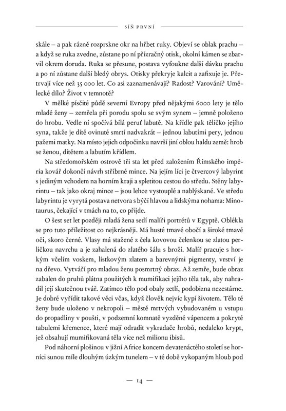 Po cestě „hlubokým časem“ – závratnými prostory geologického času – se přesouváme od původu vesmíru k Zemi po vyhynutí lidí, zastavujeme se u pohřebišť doby bronzové, pařížských katakomb, tajících Grónských ledovců, bezhvězdných řek a arktických mořských jeskyní, podzemních fungálních sítí, pomocí nichž spolu komunikují stromy, a hlubinné „skrýše“, kde se má po následujících 100 000 let skladovat jaderný odpad.