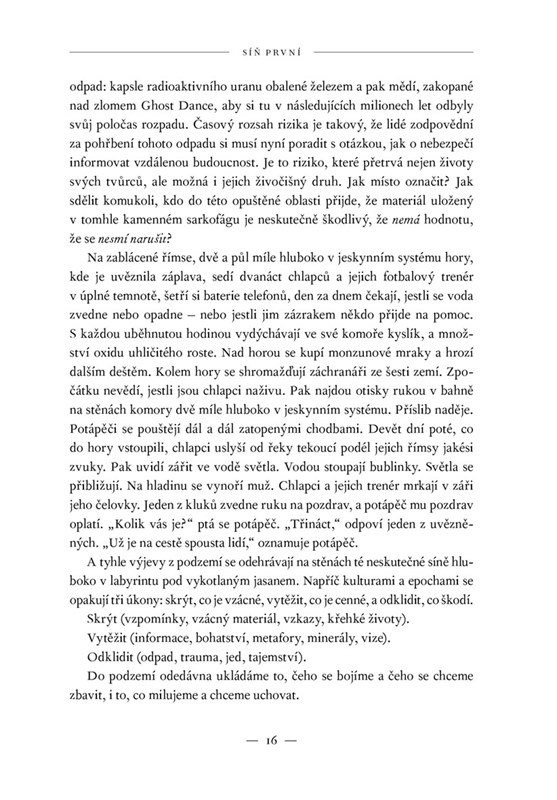 Macfarlaneův lyrický a působivý text mocně promlouvá k současnému světu v celé jeho šíři. Od pozoruhodných úvodních stran až po dojemný závěr je to cesta úžasu, žalu, strachu a naděje. Podzemí je nový přelom v Macfarleneově dlouholetém mapování vztahů mezi krajinou a lidským srdcem. Tahle kniha, zároveň odvěká i naléhavá, změní způsob, jakým nahlížíte na svět.