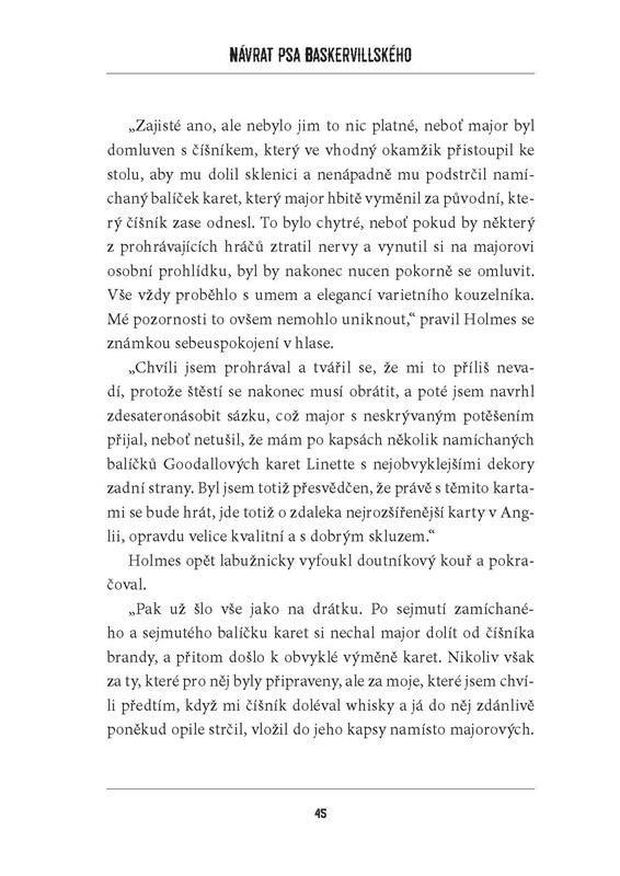 Představte si, že Jack Stapleton neutonul na blatech. Na chvíli si o představte. Třeba jako dr. Watson. Můžete zcela vyloučit možnost, že Stapleton přece jen nalezl za noci a mlhy cestu ven? Ne. Proto se několik týdnů po vyřešení baskervillské záhady se zuřivým psem vydává Sherlock Holmes spolu s dr. Watsonem znovu na místo činu. Souběžně se ovšem, jak je jejich dobrým zvykem, oba nevyhnou řešení několika vedlejších zapeklitých záležitostí, z Holmesova pohledu ovšem zcela banálních.
