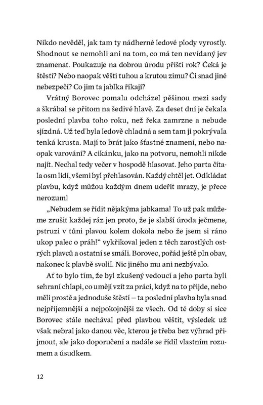 V nové knize Nory Eckhardtové se noříme do dvou příběhových linií. V blíže neurčené minulosti se odehrává tragický příběh voraře Jakuba a jeho snoubenky Loty, v současnosti se setkáváme s mladíkem Adamem, pátrajícím po ztraceném otci, a jeho přítelkyní Juditou. Mezi oběma příběhy protéká řeka Černá. Poklidně i prudce. V jednu chvíli hrdiny jemně kolébá, aby je vzápětí strhla do svých temných hlubin.