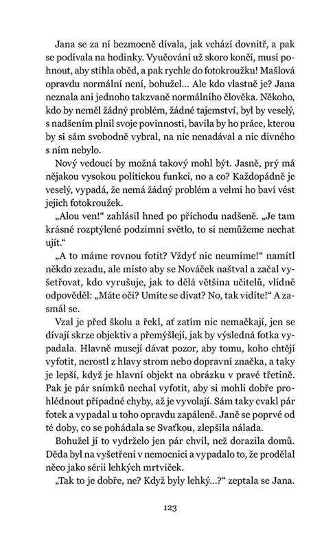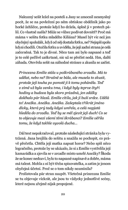 I tentokrát se Lucie Hlavinková nechala inspirovat rešerší historických pramenů z temného období socialismu. Píše se rok 1982 a v patnáctileté Janě se kromě dospělosti probouzí i poznání, že s minulostí její rodiny není cosi v pořádku. Otec před rokem zemřel a v matčině ložnici se ukrývá sešit plný nepochopitelných zápisků. Prarodiče se chovají přinejlepším výstředně a mluvit před nimi o některých tématech je tabu. Jana dospívá v totalitním bezčasí, přesto není otupělá – a tak se pouští do pátrání. Dokáže najít pravdu o rodinné historii i vlastní identitu?