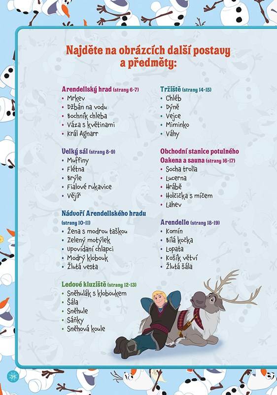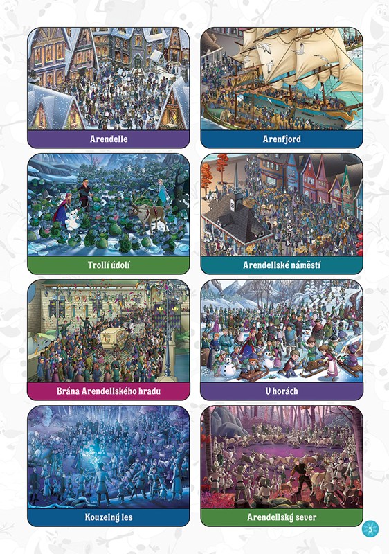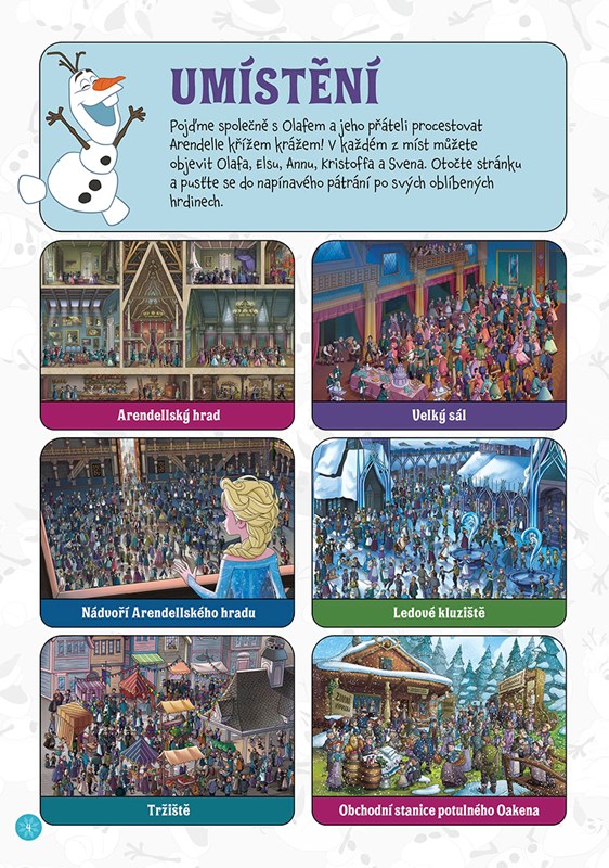 Prozkoumejte překrásná zákoutí Arendelle – od královského hradu až po tajuplné Trollí údolí - a hledejte při tom na obrázcích Annu, Elsu, Kristoffa, Svena a samozřejmě Olafa! Přitom si procvičte postřeh, trpělivost a soustředění.