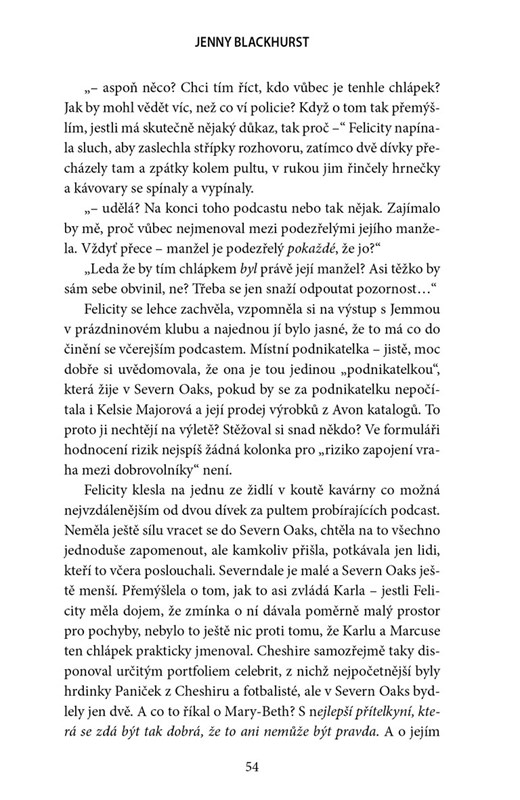 Uplynul rok od doby, kdy Erica Spencerová zemřela po pádu ze schodů. Tragická nehoda se odehrála na halloweenském večírku, kterého se zúčastnili všichni Eričini přátelé z exkluzivní čtvrti Severn Oaks. Místní už pomalu zapomínají a jejich životy se vracejí do zajetých kolejí. Jenomže pak se na Facebooku zdejší školy objeví oznámení, které vyvolá zlověstné vzpomínky – připravuje se podcast, jehož autor prozradí, co se oné noci doopravdy stalo.