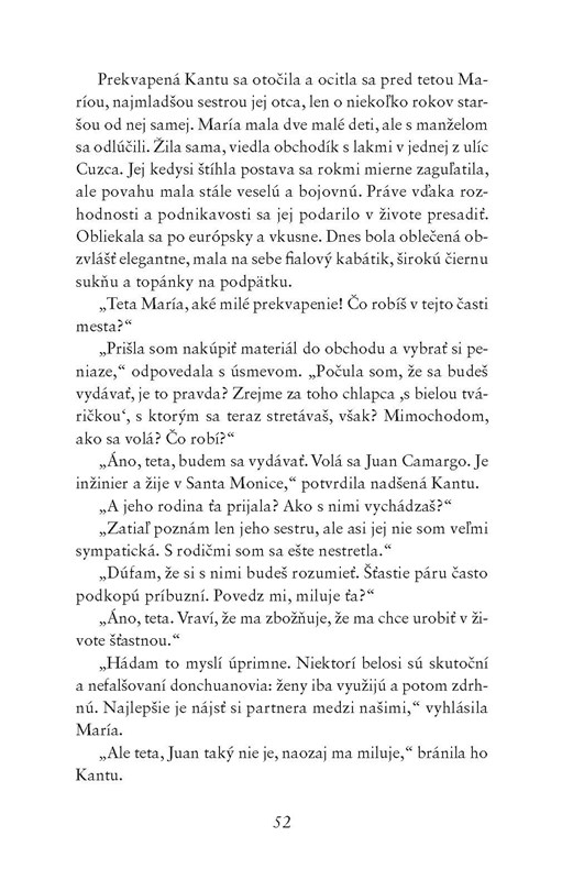 Je mladá, krásna a má mnoho záujmov. Žije v Cuzcu, kde trávi svoj život pokojne a bezstarostne. Kantu sa o učenie Pachamamy (Matky Zeme) ani o prírodných liečiteľov a šamanov nikdy nezaujímala, až kým nepredvídaná udalosť nenaruší jej istoty a neprevráti jej život hore nohami. Vtedy svoj odmietavý postoj k starým tradíciám nakoniec prekoná. Len stretnutie s kuranderom, indiánskym šamanom, a jeho prastarou múdrosťou ju dovedie k objaveniu obrovskej životnej energie, ktorú v sebe má, a k obnoveniu stratenej harmónie.
