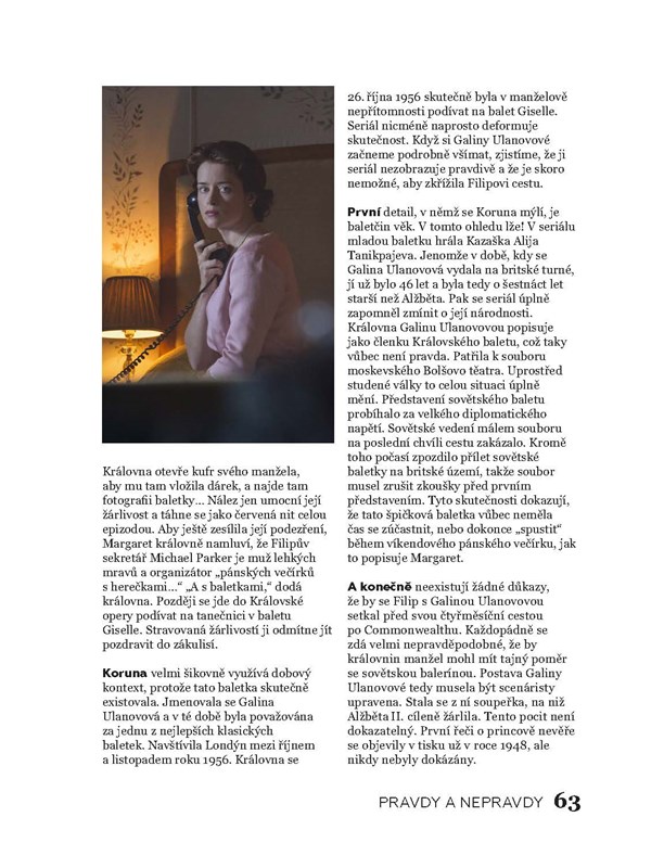 Kniha Koruna - pravdy a nepravdy pomáhá fanouškům seriálu rozeznat fikci od reality. A dělá to nesmírně poutavým způsobem, kdy věnuje každou kapitolu jedné sérii, v níž rozebírá jednotlivé epizody a jejich nejzásadnější momenty. Vše v krásném grafickém provedení, proloženo spoustou dobových fotografií, které autoři často porovnávají se snímky ze seriálu.