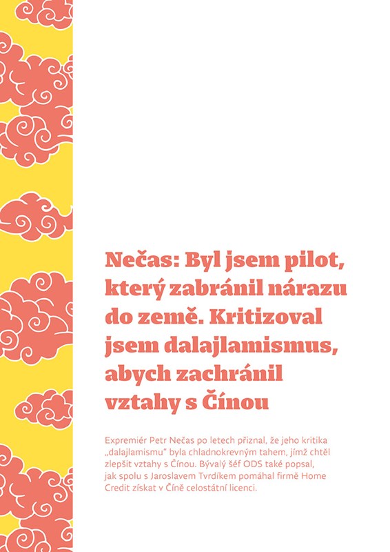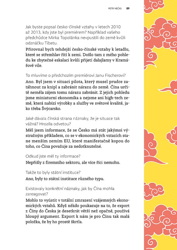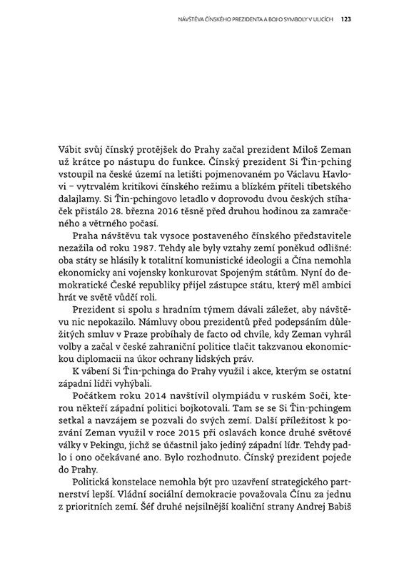 Česko bylo v posledních třiceti letech v pohledu na Čínu a naše vztahy k ní rozdělené na dva tábory. Ten první vidí tuto zemi zjednodušeně jako totalitní mocnost, která potlačuje práva svých obyvatel, ten druhý jako ekonomického obra, který nabízí ohromnou příležitost pro český byznys. Čína však není pouze totalitní říše zla, či naopak jen továrna na peníze. Je to země, v níž žije asi pětina všech obyvatel světa, má hlubokou historii a kulturní svébytnosti a je klíčovým politickým hráčem, se kterým je třeba počítat.