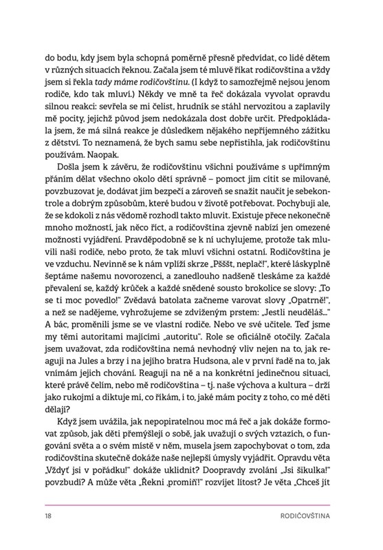 Věděli jste, že pochvalou „To se ti moc povedlo!“ můžete dítěti ve skutečnosti ublížit nebo že když potomka nutíte, aby hezky poděkoval, jde o nejhorší možný způsob, jak ho naučit slušnému chování? Lehrová opírá svůj dynamický text o výzkumy psychologů, pedagogů a organizací specializujících se na rozvoj dětí a představuje vědomý přístup k rodičovství založený na lásce a respektování dítěte jako individuality. Jennifer Lehrová je chytrá, vtipná a nebojácná autorka, která převrátí vzhůru nohama všechny vaše zažité představy o rodičovství.