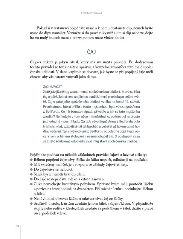 Publikace, kterou právě držíte v ruce, vás zavede do světa elegance a vybraného chování. Seznámí vás se základy kultivovaného stolování, naučí vás správnému držení příboru a sklenic, společenskému posedu a ladné gestikulaci během stolování. Také vám vysvětlí, jak být dobrým společníkem, oblíbeným hostem a skvělým hostitelem. Díky ní pochopíte, proč je slušné a taktní chování nezbytnou součástí mezilidských vztahů. Mimo jiné vás kniha také seznámí se základními typy dress code. A to vše si ukážeme na názorných fotografiích focených v luxusních interiérech.