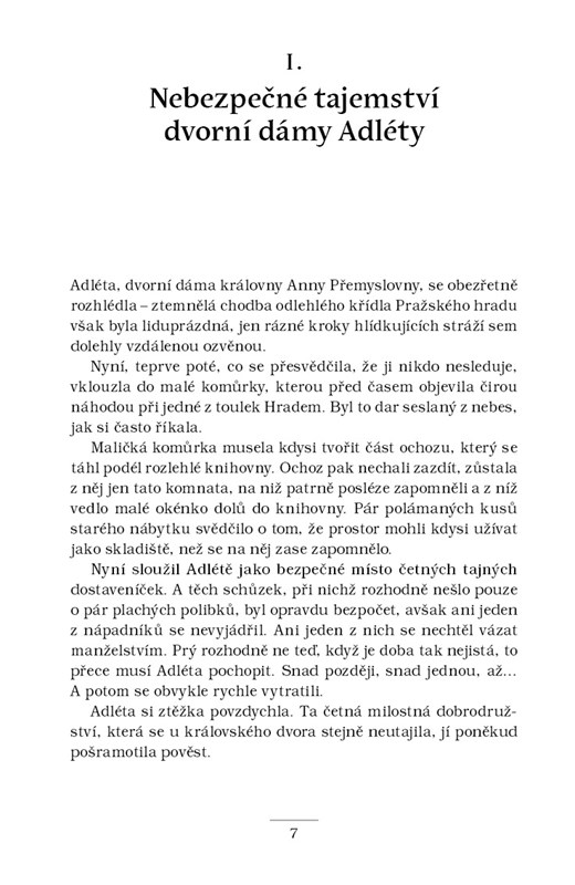 Šlechtic Adam ze Zbraslavi je po krátkém pobytu v klášteře opět povolán k pražskému královskému dvoru. O pomoc ho tentokrát požádá jeho chráněnka Alžběta, která se strachuje o život své tety Elišky Přemyslovny. Dvě z jejích dvorních dam za podivných okolností zemřely – a zdá se, že nešlo jen o zločiny z vášně. V královské rodině totiž začíná zuřit boj o korunu. Podaří se Adamovi ze Zbraslavi rozplést politické pozadí zločinů a dopadnout pachatele dřív, než sáhne smrt i po samotné Přemyslovně?