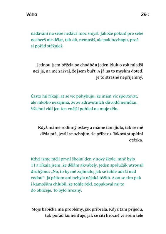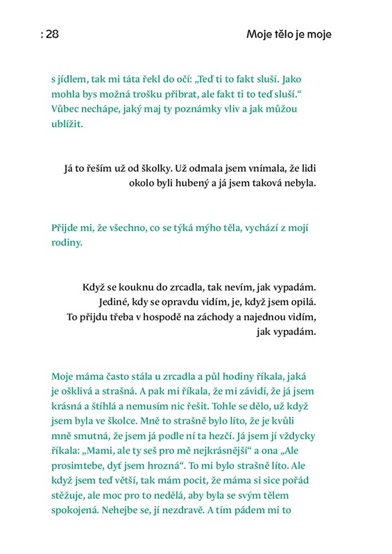 Každý den se díváš do zrcadla. Někdy je to v pohodě, ale někdy těžší. Tvoje tělo se mění, hlava jede naplno a svět okolo to často komentuje. Ale co když se chceš prostě cítit dobře? V téhle knize se setkáš s reálnými teens a mladými lidmi, kteří otevřeně mluví třeba o akné, nadváze, odlišnostech, nejistotách i o tom, co jim pomáhá, aby se jim lépe žilo v jejich těle.