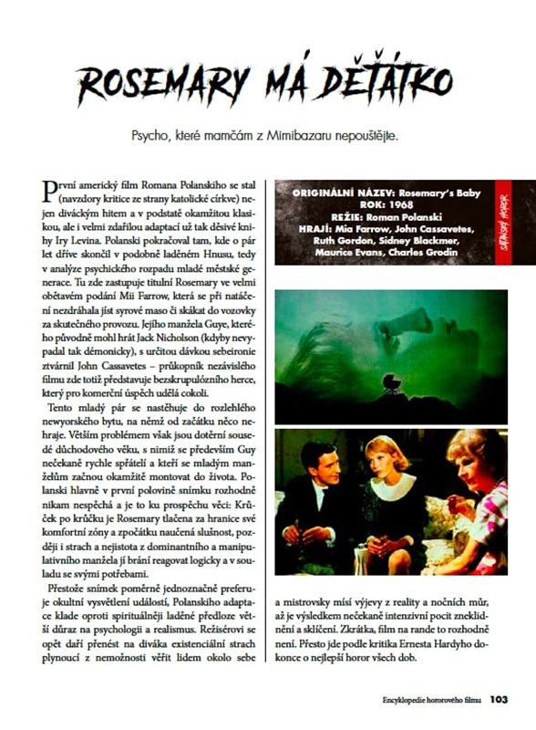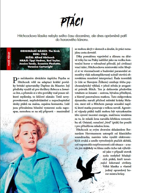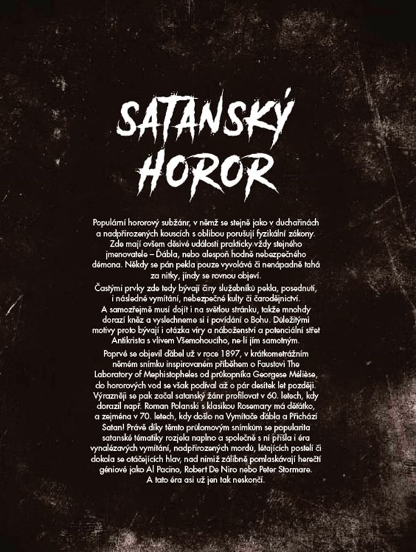 Nabruste dranžíráky i sekerky, nastartujte motorovky… ať může koupel ve falešné filmové krvi konečně začít! Ve vůbec první encyklopedii hororových filmů od českých renomovaných autorů z okruhu filmového webu Moviezone.cz na vás čekají snímky, které divákům ukázaly hrůzu z těch nejrůznějších úhlů a posunuly dimenze strachu do nevídaných výšin. Poznejte milníky hororové kinematografie, kultovní klasiky, béčka a vyložené přešlapy, ale i mrazivé okolnosti, které natáčení často doprovázely. Sérioví vrazi, šílení klauni, pomstychtiví duchové i nenasytné zombie – ti všichni už se nemůžou dočkat, až se vám dostanou do hlavy.