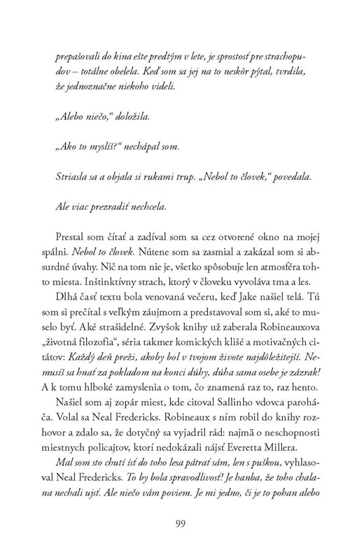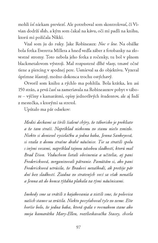 Od začiatku tam panuje zlovestná atmosféra a prvé konkrétne varovanie príde, keď sa Tom zoznámi s manželmi Davidom a Connie, ktorí nahrávajú podcasty o kriminálnych prípadoch. Rezort Hollow Falls má za sebou temnú minulosť: presne pred dvadsiatimi rokmi sa tu odohrala dvojnásobná vražda. Nikdy sa ju nepodarilo objasniť a lesy sa pri príležitosti tragického výročia hmýria turistami, ktorých fascinuje brutálny zločin.