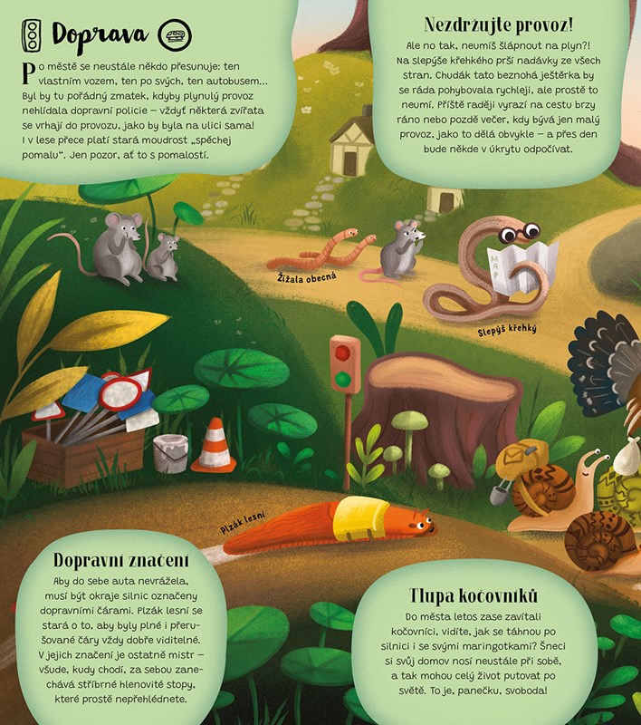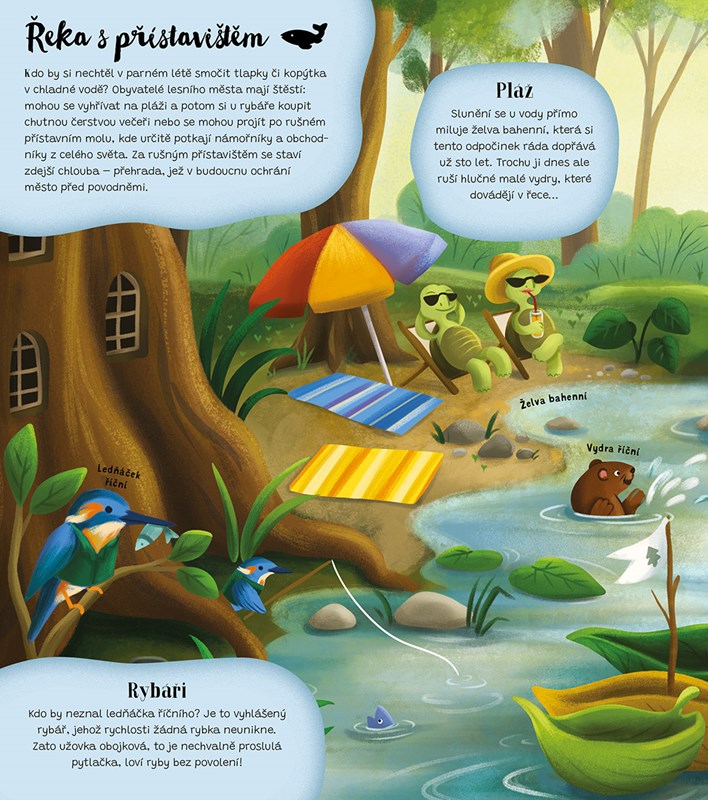 V lese to je samý spěch a shon, skoro jako by se zvířátka naučila pospíchat od lidí. Dokážete si představit, že by to v lese fungovalo stejně jako ve městě? Vůdce organizované vlčí smečky hravě zvládne funkci starosty, jeleni tvoří místní smetánku a havran dokáže takové divy, že připomíná pouliční komedianty. Funguje tu holubí pošta a o noční život také není nouze. Nahlédněte do lesního města a dozvíte se spoustu novinek o jeho obyvatelích i důležité informace o každé městské čtvrti. A kdybyste se náhodou ztratili, žádný strach – kniha obsahuje i přehlednou mapu!