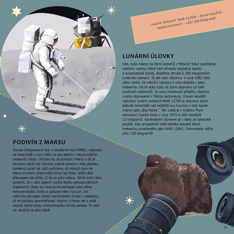 Jestlipak rozeznáte obyčejný kámen od kamene vesmírného původu…tedy od meteoritu? Že ne? Nevadí. Nevadí, protože ve svých rukách držíte knížku, která vám o meteoritech prozradí snad úplně všechno. Jak vznikají, co se děje, když letí vesmírem, a jak závratnou rychlostí dokážou letět, než dopadnou na Zemi. Dočtete se o nejvtipnějších meteoritických pádech, ale i škodách, které při tom napáchaly, a v neposlední řadě se naučíte meteority rozpoznávat. Že jsou všechny stejné? Ani náhodou! Představte si, že z jednoho kousku meteoritu umíme my lidé vystopovat, jak je naše Země stará ale také to, z čeho se skládají jiné planety. Dál už nečekejte a vydejte se s námi na velké meteoritické dobrodružství. Věřte, že to stojí za to!