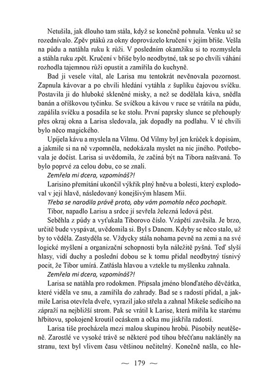 Staré rodinné sídlo, ve kterém Larisa vyrostla, skrývá nejedno tajemství. Jednou najde na půdě staré dopisy odhalující nelehký život její praprababičky Vilmy s násilnickým Hanušem, které ji zcela pohltí. Postupně si začíná uvědomovat nápadnou podobnost v chování svého manžela Viktora a Hanuše. Je to jen náhoda, nebo varování? Čtenář s napětím sleduje proplétání minulosti se současností, stejně jako tajemnou ženu zjevující se v domě. Proč ji vidí jen Larisa? Osud dvou manželských párů v dramatických zvratech zobrazuje osobní dilemata, potřebu lásky a otevírá úvahu nad tím, kdo nakonec zaplatí za naše chyby.