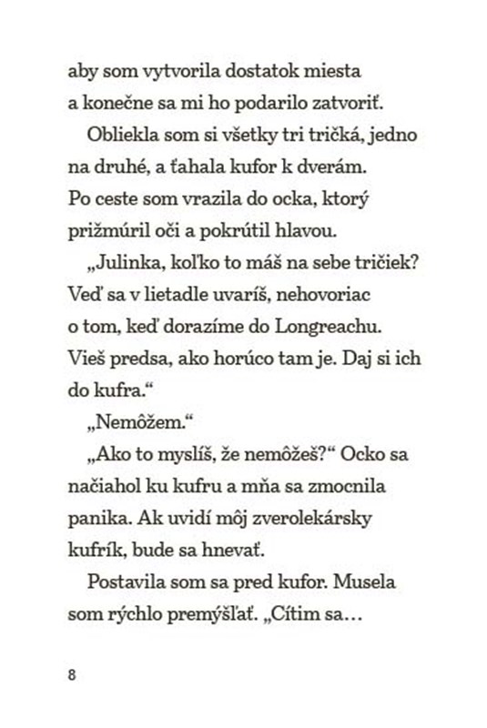 Volám sa Julinka, a keď budem veľká, chcem byť zverolekárka. V buši, kde žijú moji starí rodičia, je veľmi horúco a sucho. Teším sa, že na návštevu s nami ide aj moja najlepšia kamarátka Zuzka. Som zvedavá, aké zvieratká uvidíme! U starkých bude aj bratranec Jurko, no myslím si, že ma nemá veľmi rád a – čo je horšie – nemá rád ani zvieratá! Možno práve teraz mám príležitosť to zmeniť...