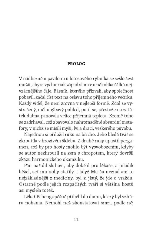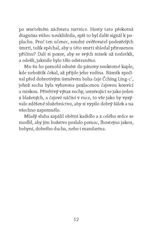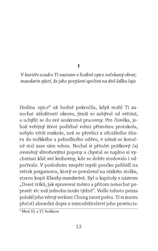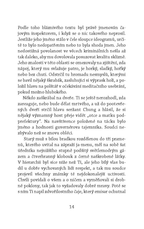 Jako každý rok císař v Zakázaném městě netrpělivě očekává osobní dodávku čaje, aby mohl oficiálně přivítat jaro. Soudce Ti si sice také rád dopřeje šálek dobrého čaje, nikdy by ho ale nenapadalo, že bude jmenován čajovým komisařem a vyslán do odlehlých končin, aby na císařskou sklizeň dohlédl. Naštěstí mu na cestě dělá společnost jeho třetí manželka, paní Cao. Jakmile Ti dorazí na místo, pouští se do řešení vražd a domnělých sebevražd, které podezřele souvisejí s lahodným zeleným nápojem. Cenným pomocníkem se mu stane toulavý mnich, který z jediného doušku odhalí vše. Připravte si i vy svůj šálek čaje a ponořte se do napínavé četby.