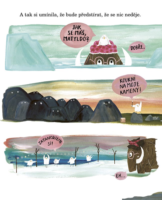 Matylda je mamut. Poslední mamut na planetě Zemi, který si v klidu hibernuje zmrzlý uprostřed ledovce. Jenže ten jednoho dne roztaje a Matylda obživne. Všichni jsou z ní nadšení, každý ji zbožňuje... Jak by taky ne, vždyť je tak milá a vypráví tak báječné příběhy na dobrou noc! Jenže Matylda zakrátko zjistí, že ona tak úplně nadšená není. Je spíš zmatená, protože svět kolem ní, v němž se ocitla, je tak hlasitý a zrychlený... Matylda je vyděšená a smutná zároveň. Ale rozhodne se předstírat, že se nic neděje, aby ostatním nekazila radost. Jenže takové předstírání stojí mamuta spoustu sil. (A co teprve malého člověka!) Matylda chtěla být aspoň chvilku sama. Posadila se k oceánu a cítila se trochu líp. Ale jen chvilku. Pak jí bylo ještě hůř než předtím. A vtom ji našli její noví přátelé. "Matyldo, tady jsi! Jsi v pohodě?" A v ten okamžik udělala Matylda něco opravdu statečného. Řekla totiž: "Ne. Vůbec nejsem v pohodě." Kamarádi ji pozorně vyslechli. A začali vymýšlet, jak Matyldě pomoci. Našli starou malbu mamutů, aby se cítila lépe, odpovídali na všechny její zvídavé otázky... Protože je úplně v pořádku říct kamarádům nebo rodičům, že se necítíte dobře. Oni vás v tom nenechají.