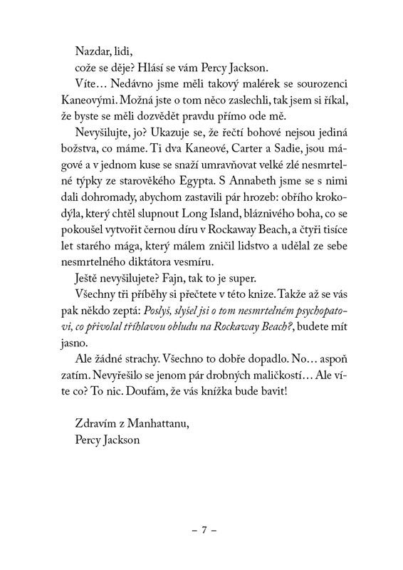 První setkání Percyho Jacksona, Annabeth Chaseové a sourozenců Cartera a Sadie Kaneových nemohlo dopadnout jinak, než že vzduchem létala kouzla a příšery útočily ze všech stran. Mladí polobohové a mágové se tak nebezpečí museli postavit společně. Přežili, ale co bude dál?