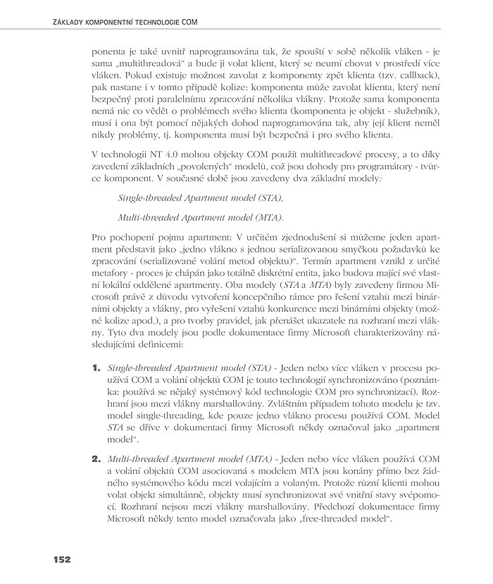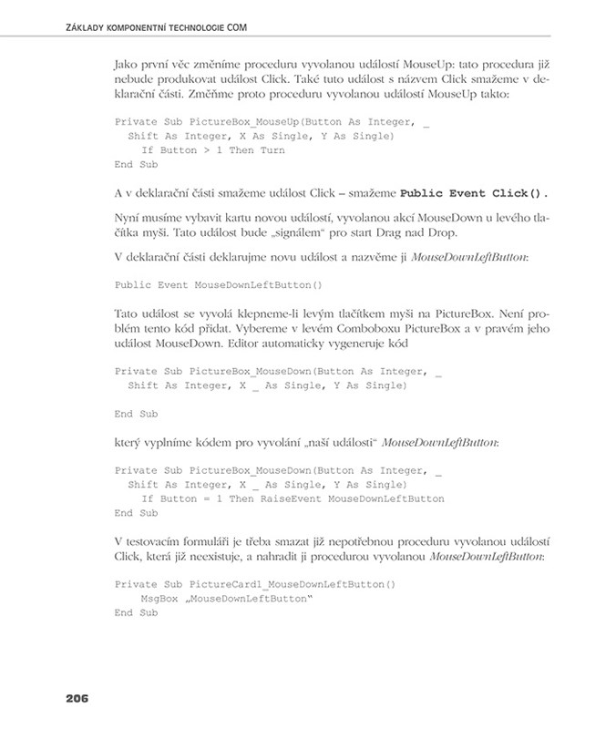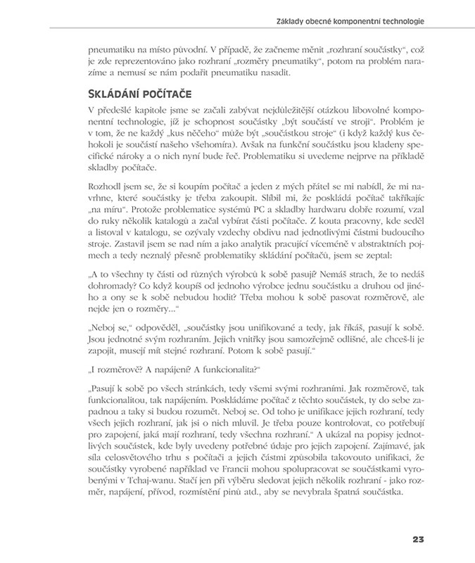 Tím je dán také cíl této knihy: vysvětlit principy komponentní technologie na její nejrozšířenější podobě, známé pod zkratkou COM (Component Object Model), která umožňuje programátorům přejít k tvorbě softwaru způsobem, jenž dá výrobě charakter skládání součástek. Přínos této knihy, průkopnické v našich podmínkách a dosti ojedinělé i ve světovém měřítku, spočívá nejen v tom, že vás v podrobném výkladu s řadou příkladů a paralel z reálného světa zasvětí do tajů COMu, ale i v tom, že tuto programátorskou technologii aplikuje na konkrétní programovací jazyk. Ilustrativní ukázky tvorby a použití komponent, s nimiž dojdete až k vlastní komponentně vytvořené aplikaci, jsou programovány ve Visual Basicu, nejrozšířenějším a dobře použitelném jazyku. Ať má kdokoli v oblibě C++ nebo jiné možné prostředky, důvodem této volby, jak autoři – zkušení programátoři – uvádějí, byla snaha „nedělat věci složitější, než jaké jsou“. V příručce zaměřené na vyvíjení efektivních a snadno pochopitelných programů bylo toto řešení logické.