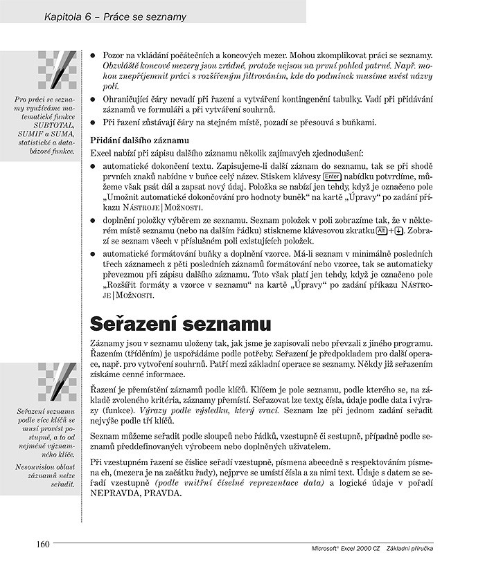 - Přílohy – užitečný přehled příkazů, ikon, funkcí, klávesových zkratek, základních pojmů a doporučení pro práci v Excelu 2000.