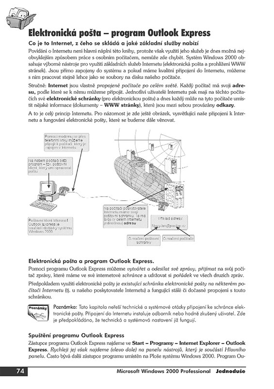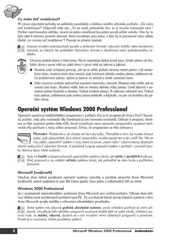 Knížka Microsoft Windows 2000 Professional Jednoduše je vlídným a snadno pochopitelným průvodcem, který naučí i naprostého začátečníka všem nezbytným dovednostem ve Windows 2000. Vychází z toho, že k úspěšné práci i zábavě s počítačem není nutno znát všechny složitosti systému, a autor při seznamování s přiměřeně volenými tématy používá snadno přístupnou formu a konkrétní postupy vysvětluje na příkladech. Po přečtení knížky Jednoduše se budete ve Windows 2000 pohybovat s jistotou a naučíte se vše, co je potřeba umět ke zvládnutí práce s operačním systémem Windows 2000 v běžné, každodenní uživatelské praxi