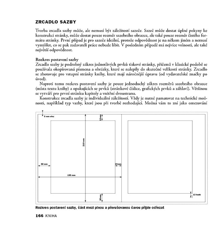 Kapitola Čeština ukazuje některé jazykové jevy z pohledu sazby (dělení slov, interpunkce nebo zkratky) a pochází z pera zkušené autorky. V kapitole Úpravy textu se dozvíte jak správně připravit text před tím, než ho použijete ve zlomovém programu. Korektura stručně seznamuje s použitím korekturních značek a korekturou v Adobe Acrobatu. Seznámení se sazbou knih, novin a časopisů a s některými problémy naleznete v kapitole Kniha, kde je také vysvětleno správné řazení stránek knihy.