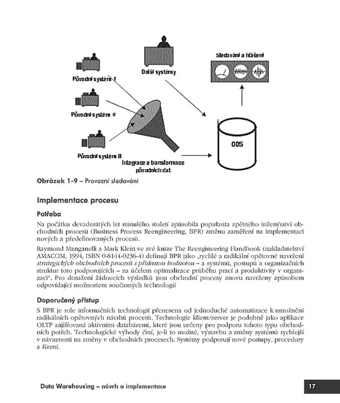 Základní publikace v oboru přináší vše pro účastníky projektu zavádění datového skladu: vysvětlení problematiky, ukázky možných řešení, kroky realizace, návrh systému a metadat, začlenění do stávajících podnikových systémů, plnění a přístup k datům, kritéria pro výběr vhodného hardwaru i softwaru. Doplněno praktickými postupy pro systémy Business Objects a SQL Server 2000 (ten je rovněž na CD).