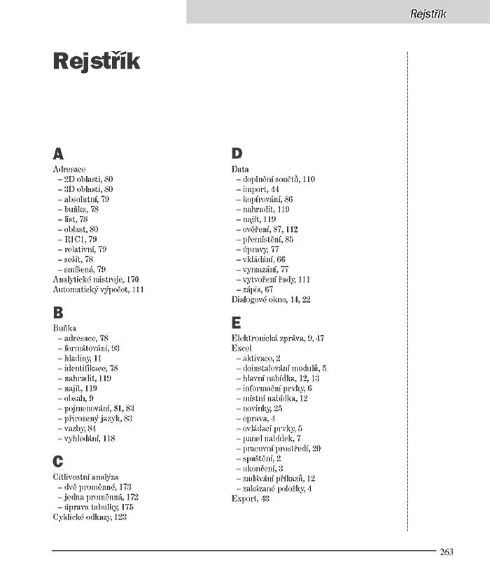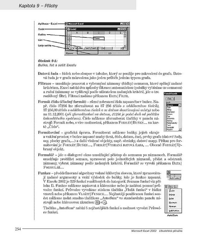 - Přílohy – užitečný přehled příkazů, ikon, funkcí, klávesových zkratek, základních pojmů a doporučení pro práci v Excelu 2002.