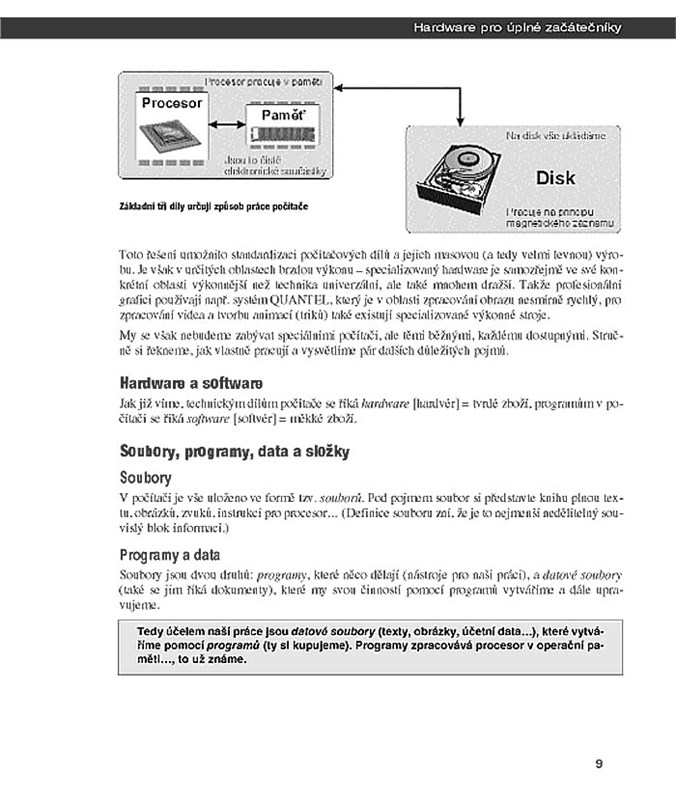 Dnešní svět počítačů je příliš rozsáhlý na jedinou tenkou publikaci, a proto bylo nutné stanovit určité hranice. Autor se zde rozumně zaměřil především na modernější stroje, i když většina věcí platí i o těch starších. Dozvíte se něco málo z historie počítačů, poznáte, že funkční jádro počítače tvoří především základní deska, procesor a paměť a že na jejich souladu záleží výkon a hladký provoz celé sestavy. Autor vás provede světem počítačového obrazu, takže se dozvíte, jak se obraz vytváří, porozumíte grafickým kartám a zjistíte, že počítač může fungovat i jako televize nebo domácí kino. Stranou nezůstane ani zvuk, protože v současné době mohou počítače fungovat nejen jako slušné hifi soupravy, ale dokonce i jako nahrávací studia. Neopomineme ani zařízení pro ukládání dat: pevné disky, CD a DVD mechaniky, disketové jednotky a oblíbené vypalovačky.