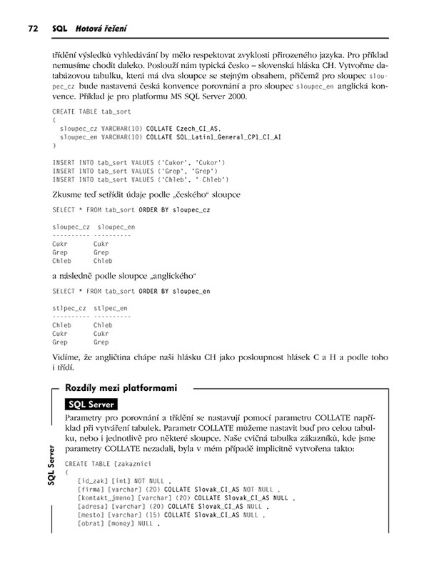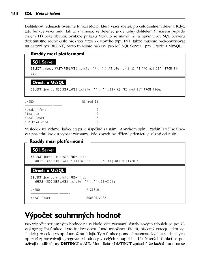 Protože se některé nuance jazyka SQL v produktech různých výrobců mírně liší, uvádí autor v takových případech přehledně správné znění v Microsoft SQL Serveru, Oracle popř. MySQL – u nás v praxi nejčastěji používaných systémů. Knížka je tak i dosud chybějícím aktuálním referenčním zdrojem všem, kdo ve své práci nejsou omezeni na jedinou platformu. Řešení jakých úkolů a problémů v knize najdete? Například: