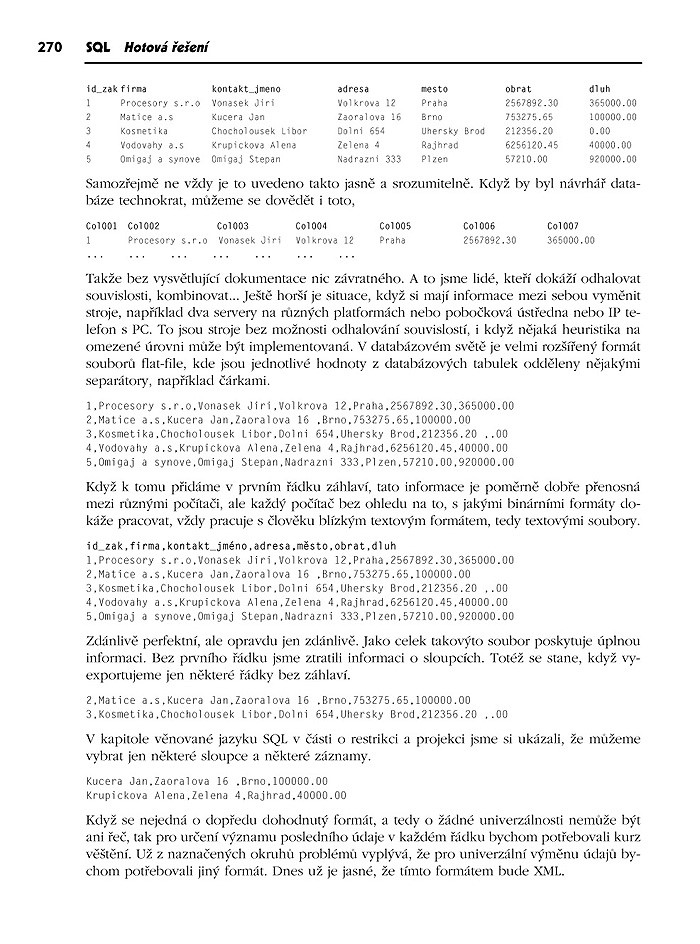 Kniha o jazyku SQL z edice Hotová řešení je prospěšná programátorům databází a tvůrcům WWW stránek hned ve dvou ohledech: jednak je učí základy tohoto jazyka na ukázkách typických příkladů, jednak je předkládá v takové podobě (v knize i na CD), abyste je mohli po potřebných úpravách okamžitě aplikovat na vaše vlastní databáze či programy. Příklady jsou vždy předem vysvětleny, dostatečně komentovány a přehledně uspořádány, každá kapitola začíná stručným osvětlením nezbytných principů.