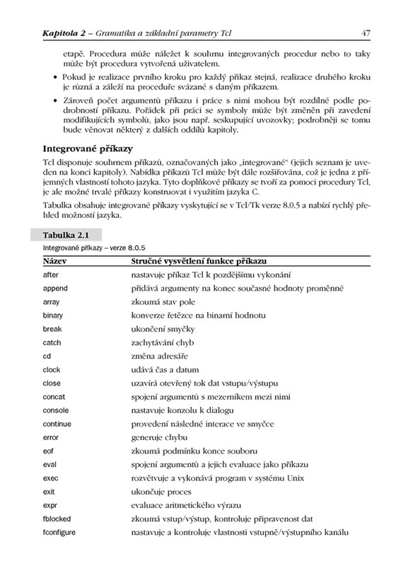 - Část I podává základní vědomosti o jazyku Tcl a jeho mechanismech. Popisuje deklaraci proměnných, výrazů, vytváření procedur, operace s řetězci, seznamy a poli a předkládá postupy pro vytváření i provádění skriptů a vstupně-výstupních operací.