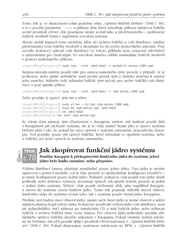 Knoppix vám bude užitečný při běžné práci, ale ještě více jej oceníte v případné roli správce systému. Tato kniha vám ukáže, jak používat jeho nástroje efektivním a přímočarým způsobem. Přečtete si 100 triků ze všech oblastí práce s Knoppixem: poznáte Knoppix opravdu na maximum.