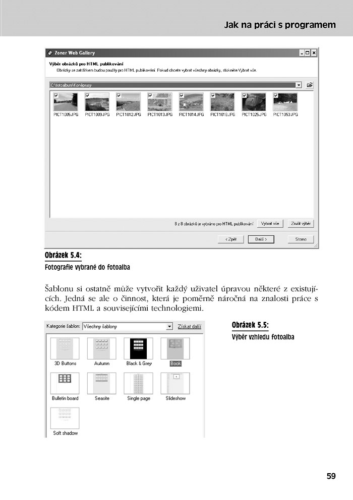 Součástí výkladu je také postup instalace a ovládání populárních programů určených pro tvorbu fotoalb – JAlbum, Zoner Web Gallery, Picasa a ACDSee. Každý z nich je určen pro jiné spektrum uživatelů, takže si z jejich nabídky lehce vybere kdokoli, začátečník i pokročilý.