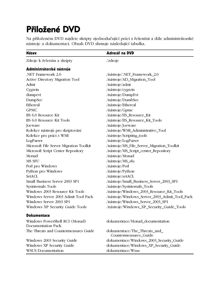 DVD přiložené ke knize obsahuje skripty a další zdroje řešení popisovaných v knize, dále velké množství administrátorských nástrojů, Service Pack pro Windows Server 2003 a Small Business Server 2003, a taktéž dokumentací a Resource Kit některých nástrojů obsažených na DVD.