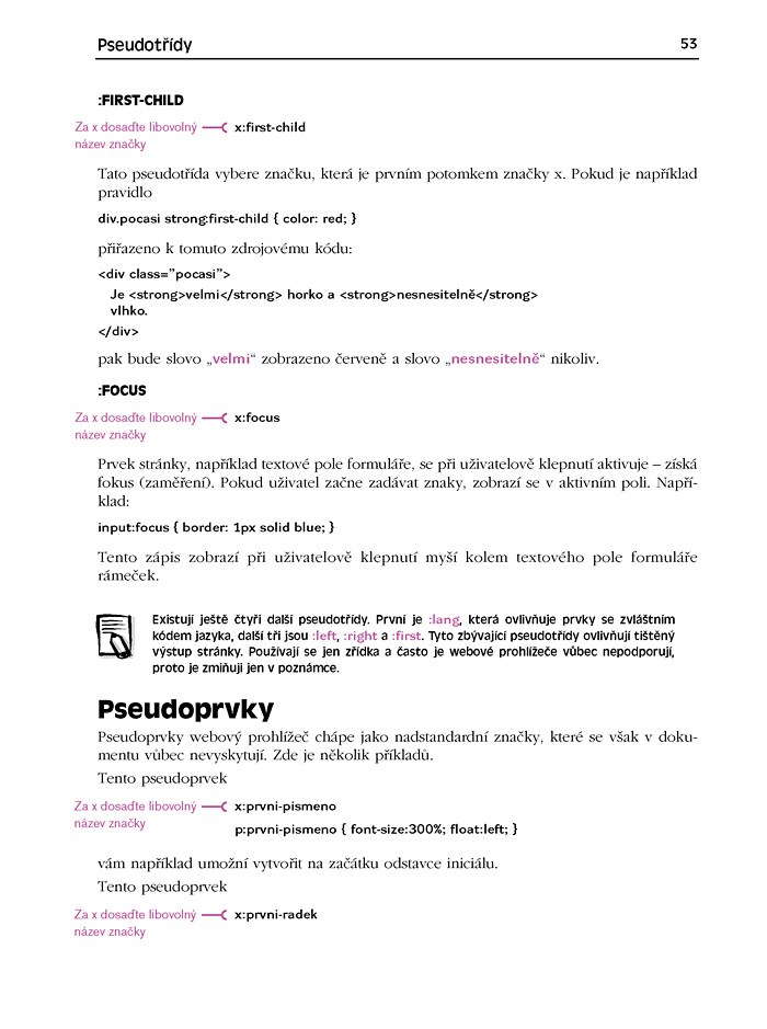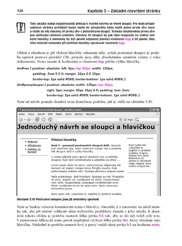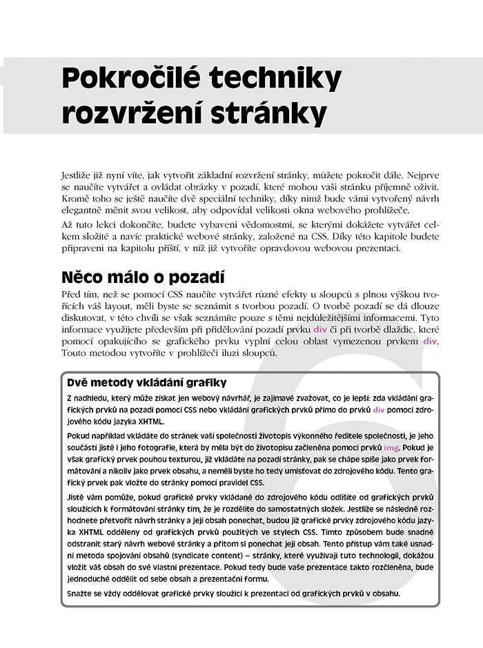 Veškeré vědomosti si můžete vyzkoušet na tvorbě kompletního projektu webové stránky, takže si tvorbu částí i celé stránky snadno a praktickým způsobem osvojíte. Popisované části ukázek kódu jsou v knize barevně odlišeny a pečlivě a přehledně okomentovány.