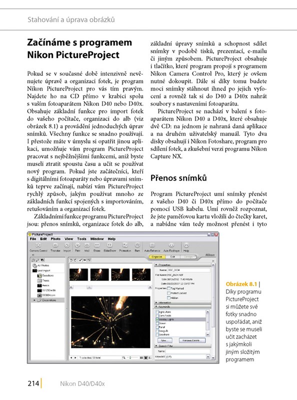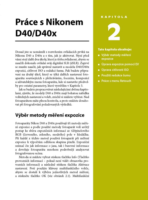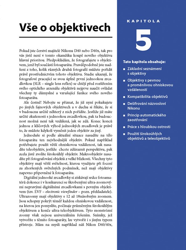 S koupí digitální zrcadlovky Nikon D40 nebo Nikon D40x se vám dostal do rukou jedinečný a spolehlivý nástroj pro vyjádření svých fotografických vizí. Tato kniha vás naučí využívat všech jejích schopností a možností tak, aby výsledné fotografie odpovídaly vždy vašim očekáváním. Není tak v žádném případě pouhým manuálem, ale spíše podrobným průvodcem, který vás upozorní na specifika fotografování s digitální zrcadlovkou Nikon, připraví vás na reálné fotografické situace a podrobně s vámi probere to nejlepší nastavení fotoaparátu v každé z nich.