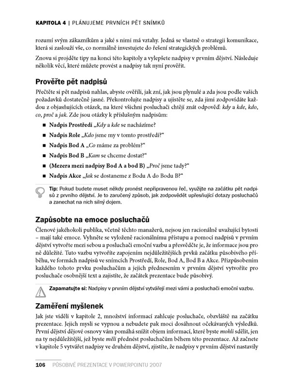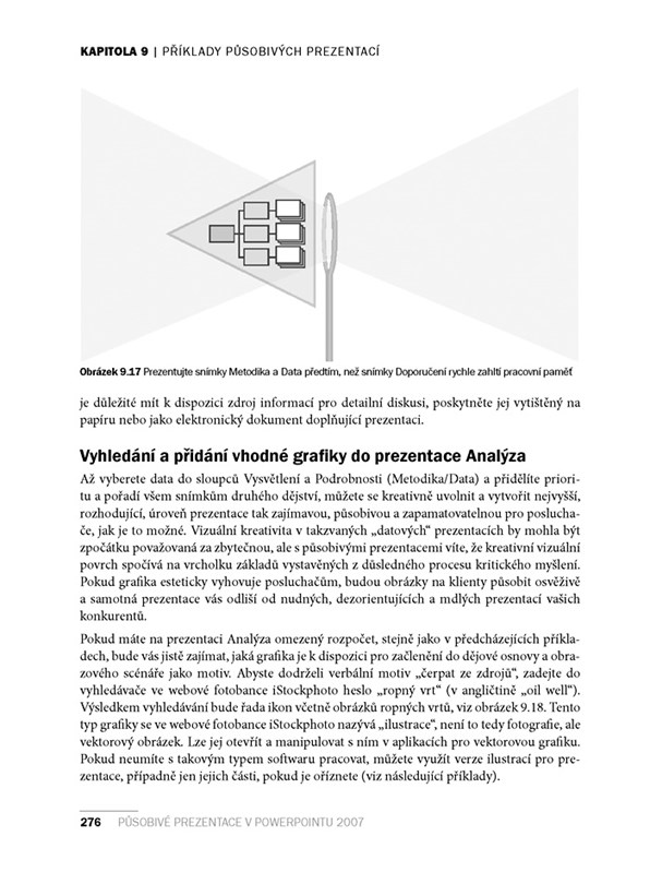 Na konci knihy naleznete několik ukázkových příkladů působivých prezentací pro různá prostředí a přehledné kontrolní seznamy pro každou prezentaci.
