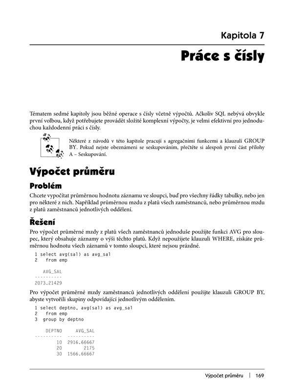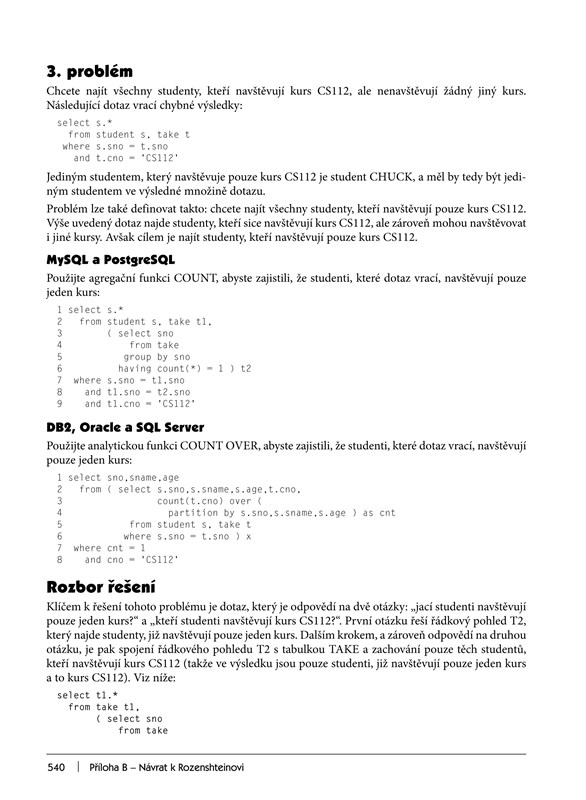 Kniha pokrývá oblasti od základních operací s tabulkami a daty přes vyhledávání a zpracování jeho výsledků až po komplikované složené dotazy pracující s několika tabulkami. Některé kapitoly jsou věnovány i operacím se specifickými datovými typy.