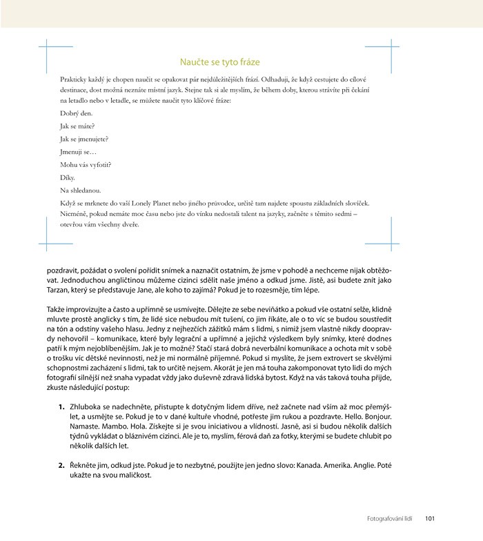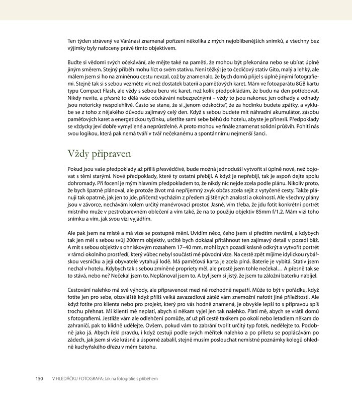 Autor vás provede vším, co budete na cestě za vlastním fotografickým vyjádřením potřebovat. Od základních postupů pro vyprávění příběhu pomocí obrazů přes zásady fotografického eseje až po metodu, jak pomocí vizuálního jazyka vést oko diváka po snímku. Naučíte se také připravit na nejrůznější fotografické situace, abyste nepropásli jedinečný záběr jen proto, že se ostýcháte oslovit kolemjdoucí v cizím městě. S takovou výbavou pak budete moci vyrazit na tu nejdobrodružnější výpravu – cestu k vlastnímu vizuálnímu jazyku, fotografickému stylu, který naleznete ve svém hledáčku.